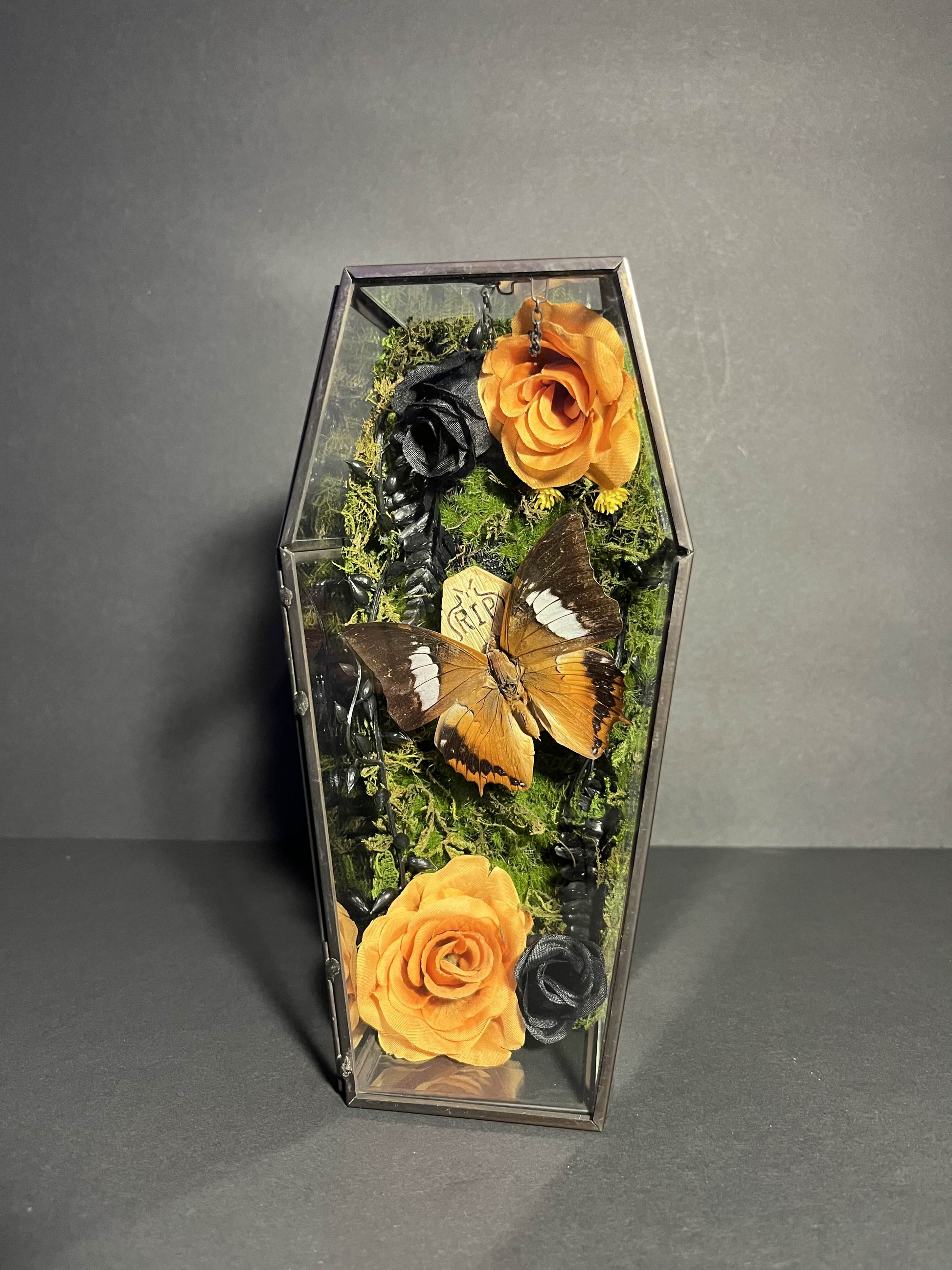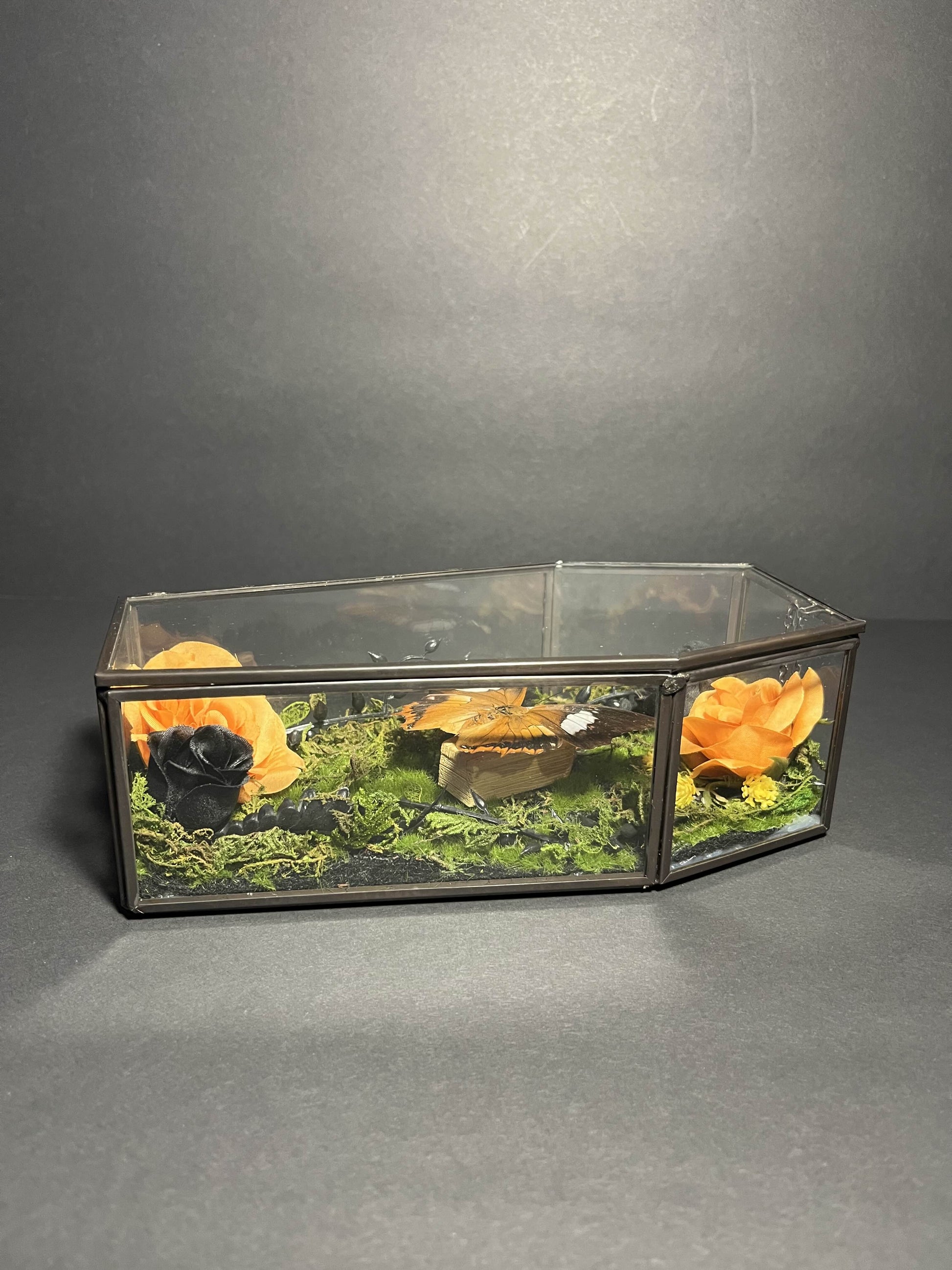 Entombed in a sleek glass coffin shaped box, this handcrafted display holds a preserved "Polyura Athamas" butterfly resting atop its own coffin in eternal slumber. Nestled in a bed of moss and shadowed by deep velvet florals, this piece evokes the delicate balance between beauty and decay.